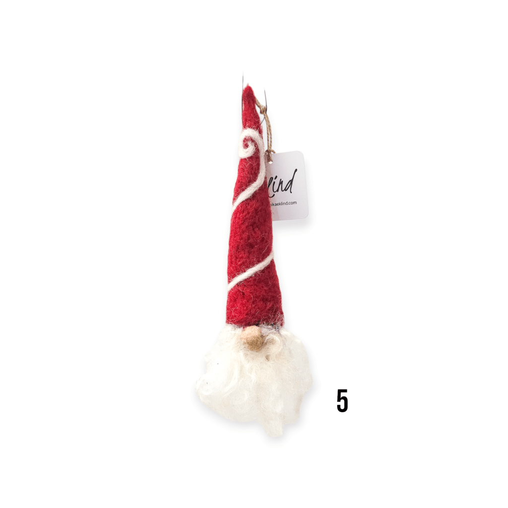 Nåltovade hängande tomtar, ca 20 cm höga. 100% ull.